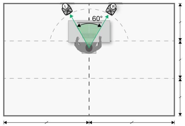 若以音乐制作为用途,请将音箱摆放到前区。将两只监听音箱呈 60 度夹角摆放,并指向听音位置。若以影视制作为用途,请将音箱摆放到后区。