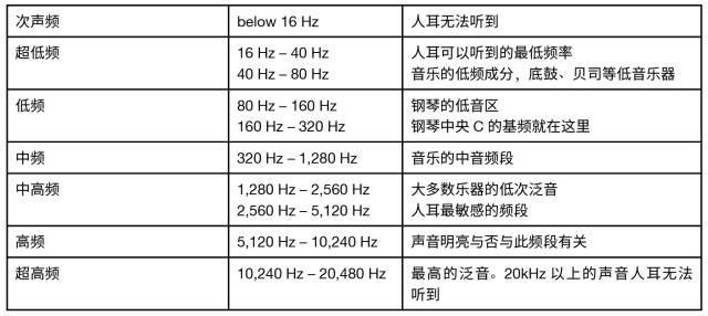 人耳可闻的频谱范围覆盖了 10 个倍频程,这一频谱范围可以被划分为如下频段: