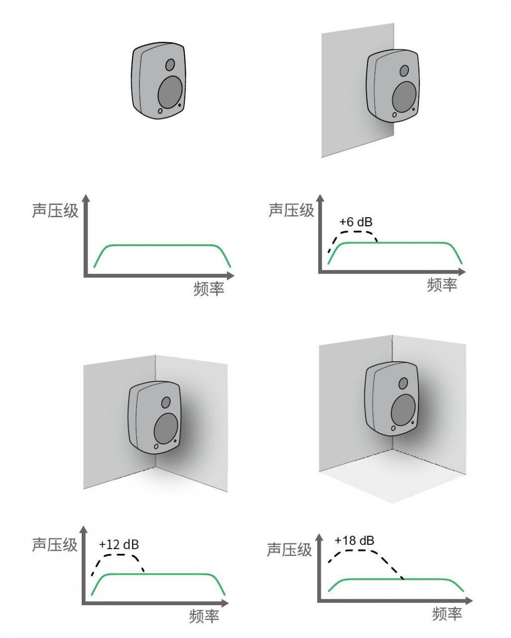 理想情况下,自由摆放的监听音箱应该具有平直的频响曲线,如果靠近墙壁摆放,低频会被增强。靠近一面墙,低频增加 6 dB;靠近两面墙的夹角(或墙和桌子的夹角),低频增强 12 dB;靠近两面墙同地板(或桌面、天花板)形成的夹角,低频增加 18 dB。