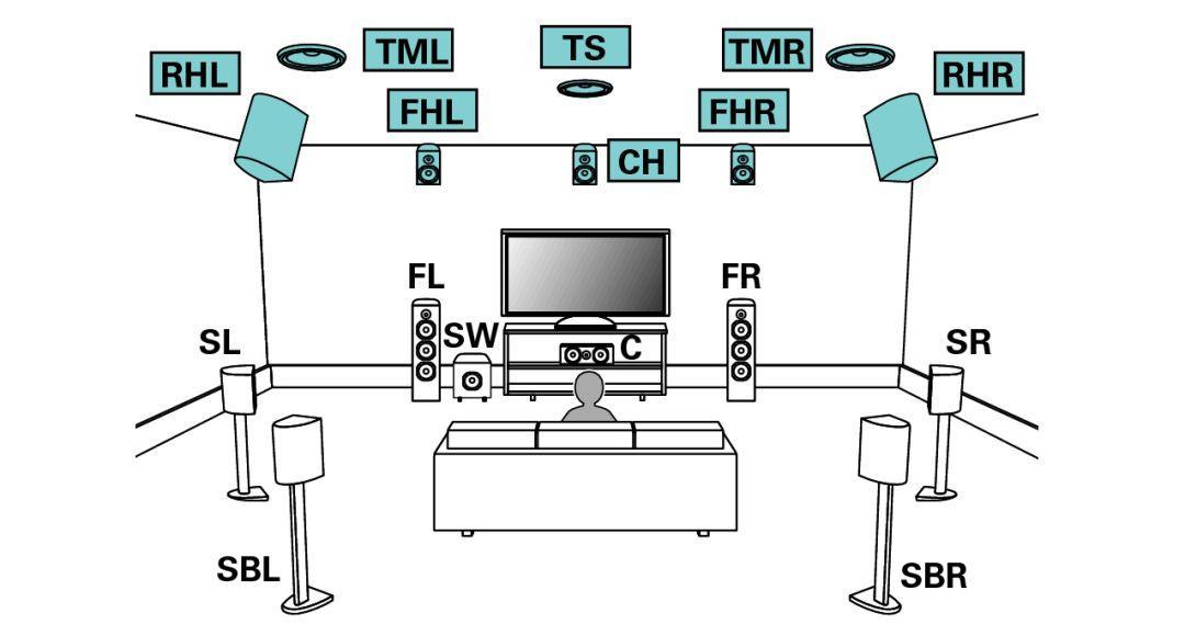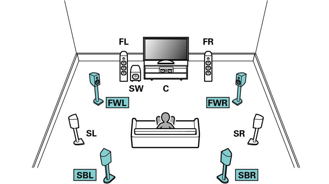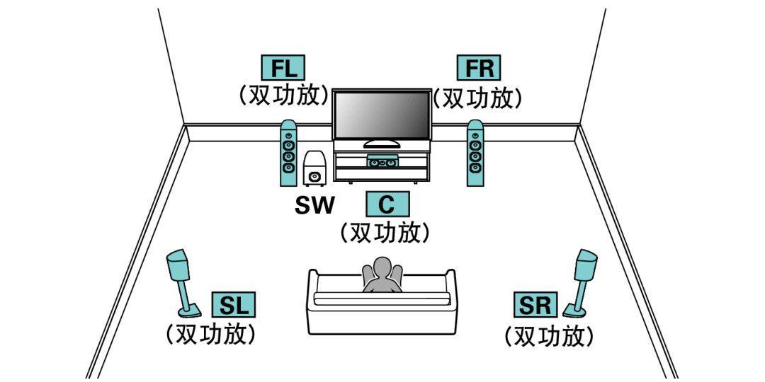 針對於沙發緊貼後牆但是房間中間還可以擺放前置增寬揚聲器