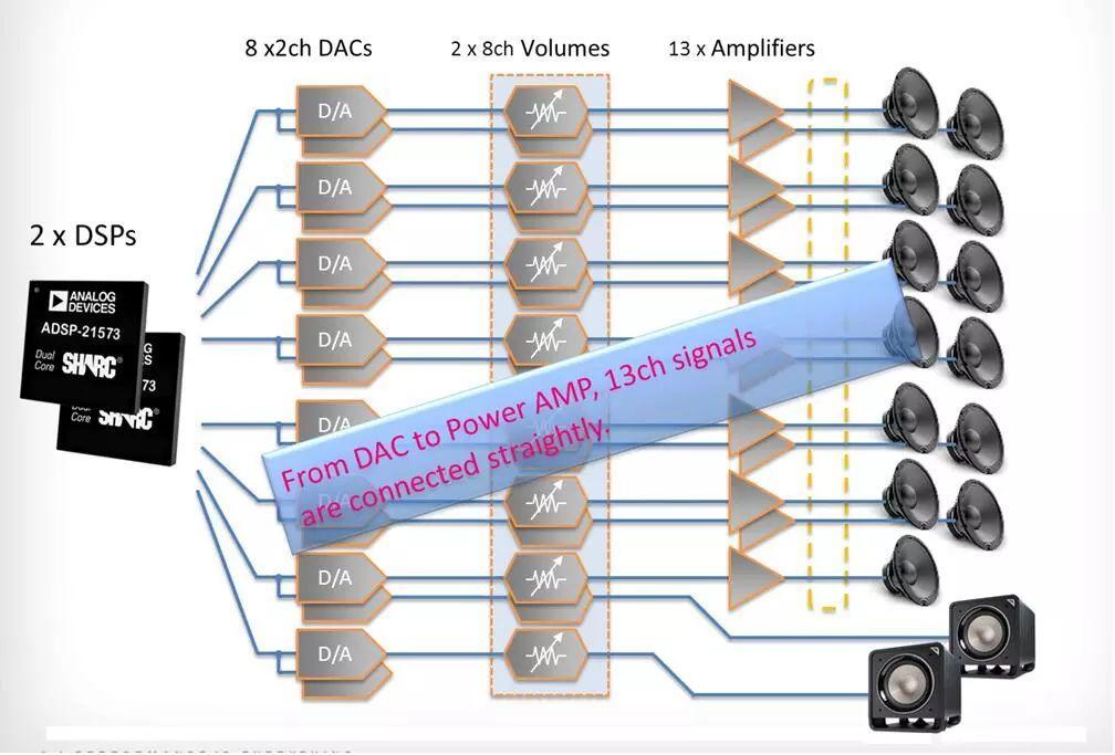 以前是兩顆DSP用於Bass Sync、AL32、奧德賽XT32 EQ、音調控制等處理,現在是一顆雙核DSP搞定