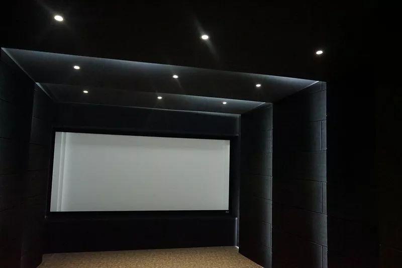用作试听面积的影音房4.1X8.3米, 面积并不算大。所以为了从视觉、舒适上综合考虑,决定采用了隐藏式定制安装。