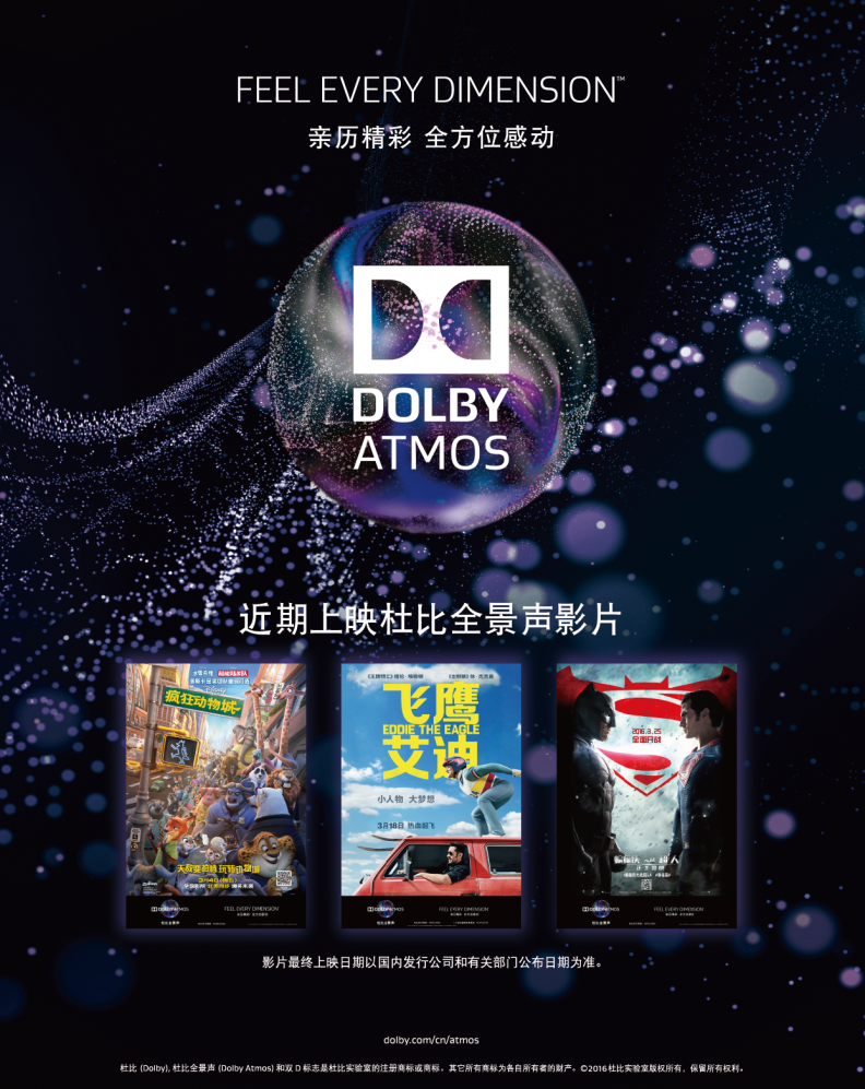 三月至,年味未尽,包括《疯狂动物城》、《飞鹰艾迪》和《蝙蝠侠大战超人:正义黎明》在内的三部好莱坞杜比全景声(Dolby Atmos)大片将在影院联翩上映,继续给观众奉上 2016年震撼的银幕狂欢。华特迪士尼动画工作室的第55部动画长片《疯狂动物城》将于3月4日在内地北美同步上映;由《王牌特工:特工学院》制片团队打造的、经由真人真事改编的体育题材传记片《飞鹰艾迪》将于3月18日内地公映;备受瞩目的华纳兄弟影业公司出品的科幻动作片《蝙蝠侠大战超人:正义黎明》将于3月25日在内地北美同步上映。在杜比全景声全方位的震撼流动音效下,极具包围感的声音与优质的电影内容完美融合,丝丝入扣,观影的全程显然是去亲历一个个精彩的故事。