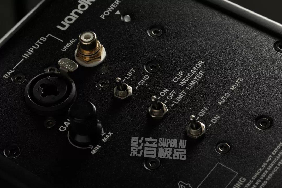 在背面板上,可調節的功能十分豐富,包括平衡BAL和非平衡RCA的輸入,其中BAL用到了瑞士紐曲克Neutrik的製品。下方的音量旋鈕具備了增益調節功能。