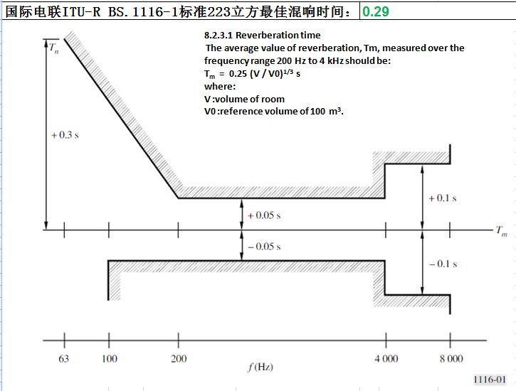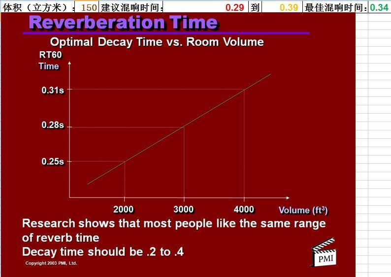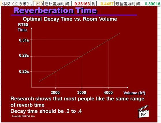 接下来我们看一下PMI更为苛刻的标准,PMI以空间的容积提出的更精细的混响时间要求来计算每个空间的混响时间,每个空间不同,混响时间的范围和最佳混响时间亦当不同。而不是一刀切。以一个220立方容积的空间为例:建议混响时间为0.33到0.45秒,最佳混响时间0.39秒