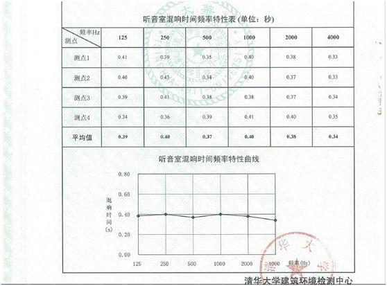 此空间投入使用状态时的清华大学国际互认资质检测报告:整个空间4个点抽测,所有点,所有频段混响时间为0.33秒到0.43秒之间,达到0.38秒正负50毫秒。