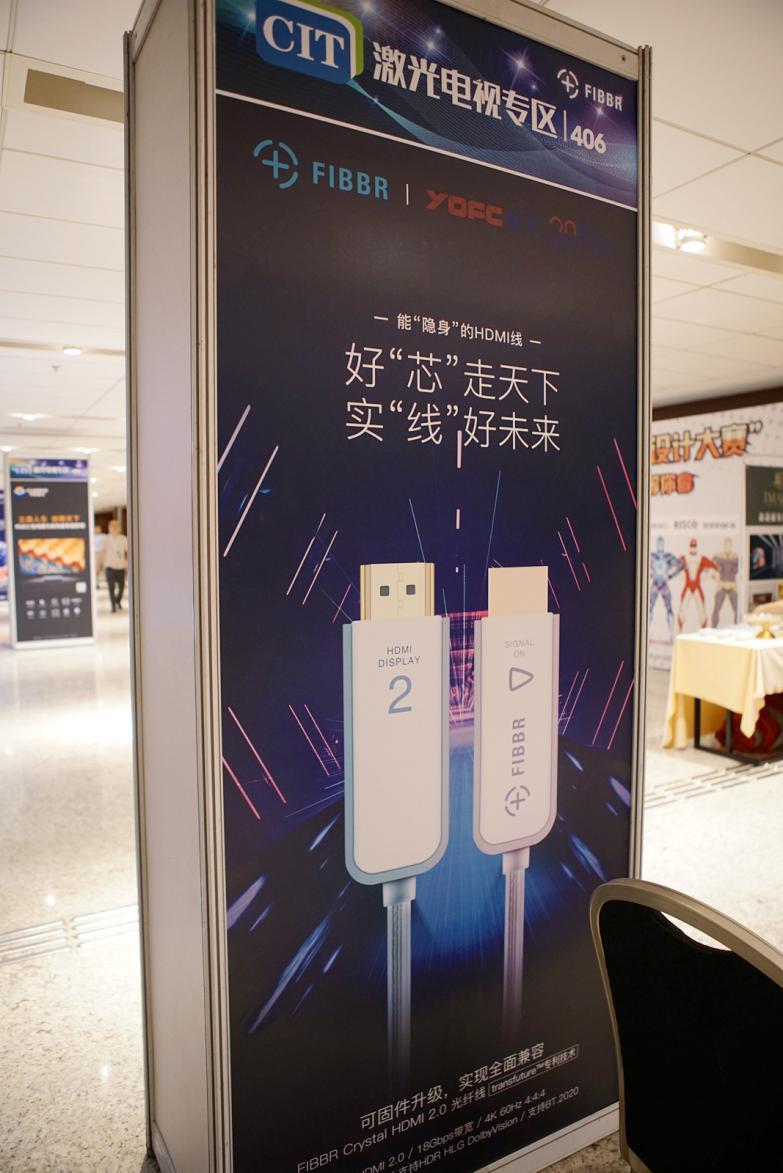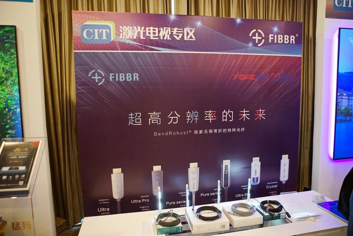 在展会的406房间的激光电视专区。国内外大牌10台主流品牌的激光电视一字排开,均使用FIBBR HDMI光纤线进行画面对比,成为激光电视画面对比活动的标准指定线材。