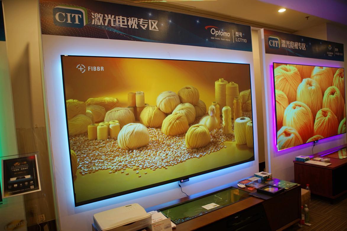 图为奥图码激光电视展台LCT110正在使用菲伯尔FIBBR线材进行4K HDR展示