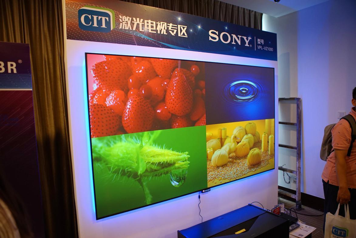 图为索尼激光电视展台VPL-VZ1000正在使用菲伯尔FIBBR线材进行4K HDR展示