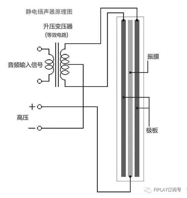 其原理是將音頻型號放大接在固定的極板上,變化的音頻信號會在兩極板之間產生變化的電場。耳機的金屬振膜處於兩極板之間,外接上極高的電壓,振膜在音頻信號產生的變化電場中,振膜上的電荷受力,從而使振膜發生擺動,形成聲音。