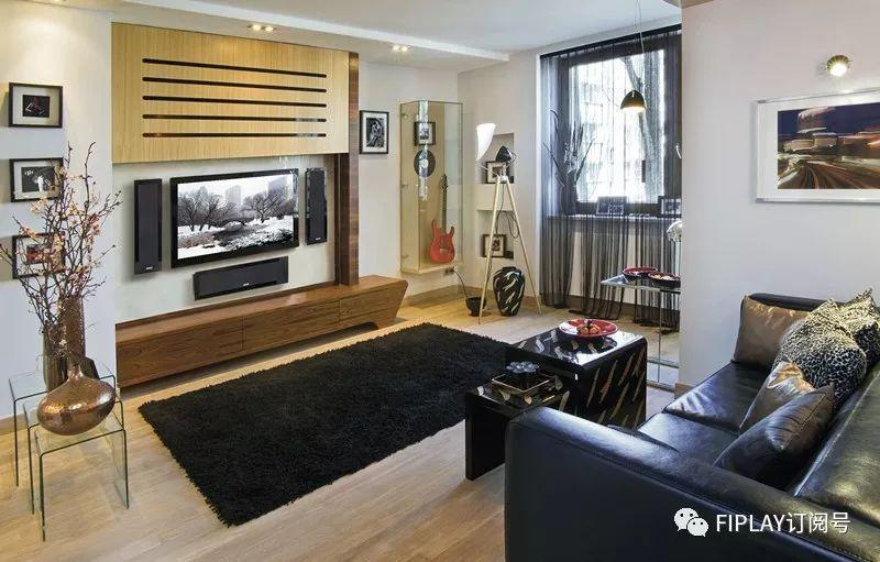 布藝或者真皮沙發及茶几的存在,對聲音起到一定的吸收和擴散作用,如果牆體或者地面都採用瓷磚或者大理石設計,聲音反射過重,一般在前牆或者後牆加裝模塊吸音板或者擴散板,在沙發和電視之間的地面第一反射區加裝一層厚的地毯,這樣可以吸收部分中高頻波段,防止聲音過尖刺耳。