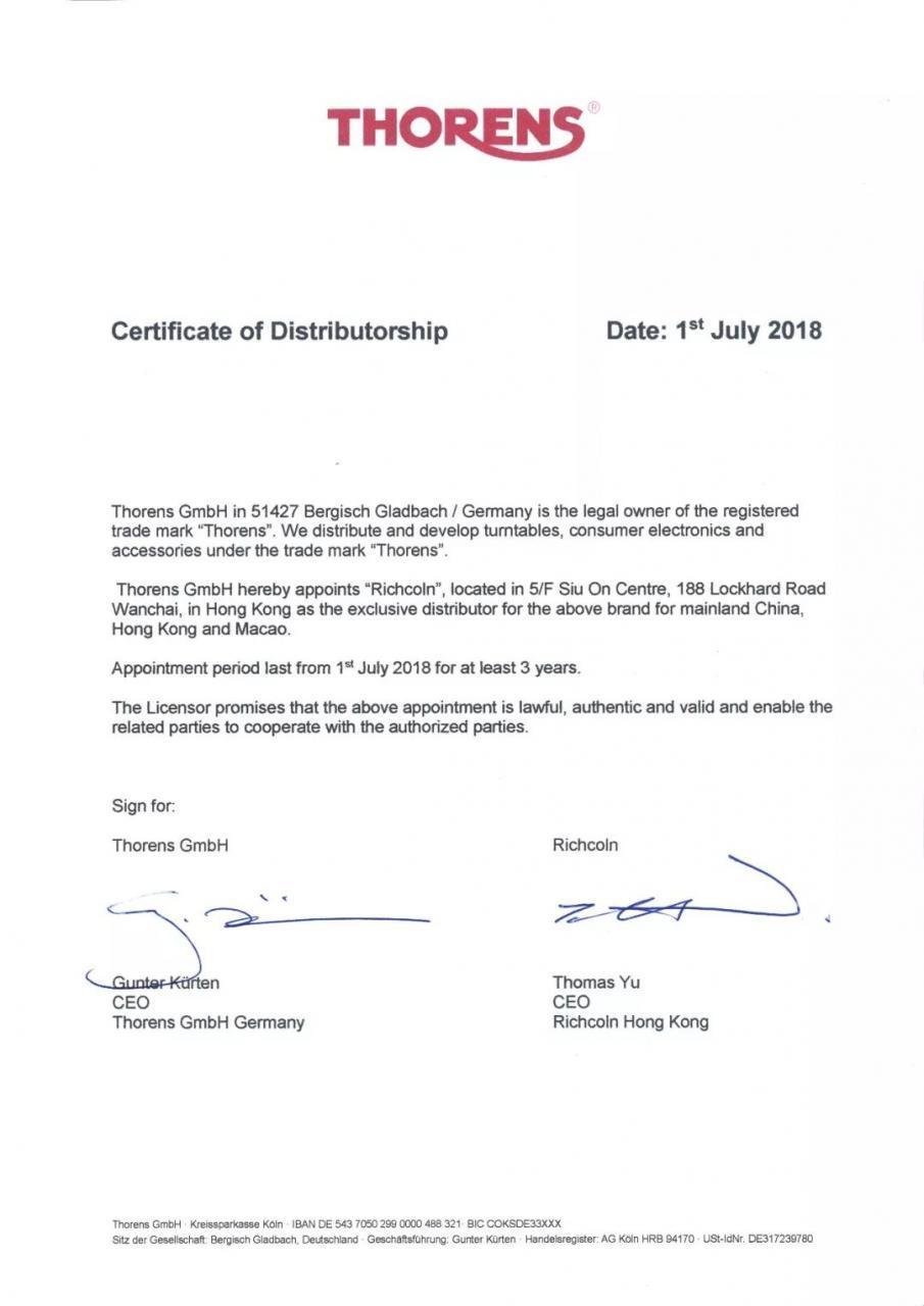由 2018 年 7 月 1 日起,新汉建业有限公司将负责上述地区之市场推广、销售及相关售后服务。新汉建业是一家具领导地位的代理商之一,于 1987 年创立,代理世界各地知名音响,今天持有的品牌达到二十多个,现再加上拥有一百三十多年历史的瑞士THORENS,中文译名为「多能仕」。