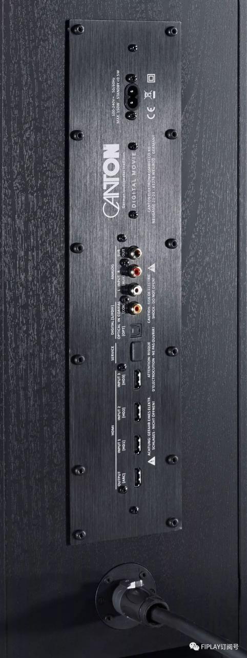 透过接头背板我们可以看到,模拟RCA立体声输入,同轴光纤数字信号输入,最新版本HDMI输入,再加上低音信号独立输出