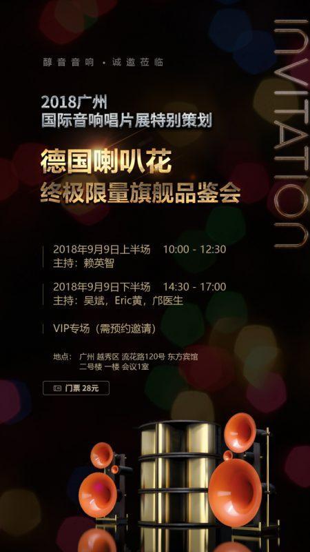 由2018广州国际音响唱片展特别策划的德国喇叭花终极限量旗舰品鉴会将于2018年9月9日在广州东方宾馆举行。