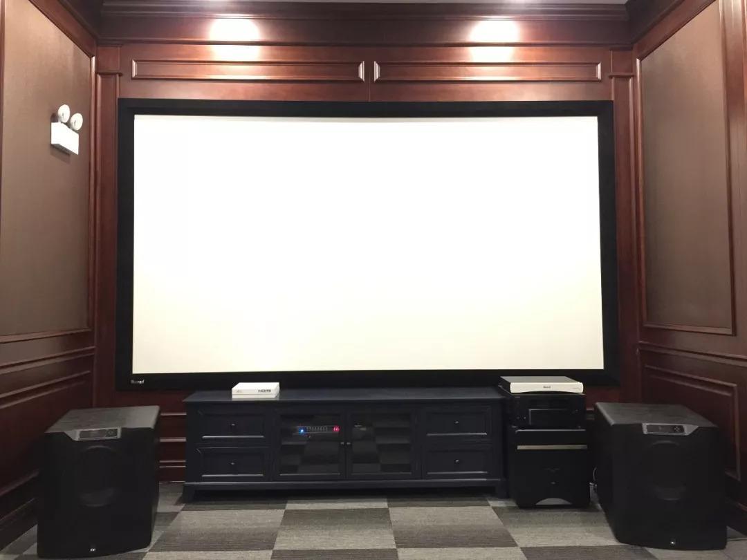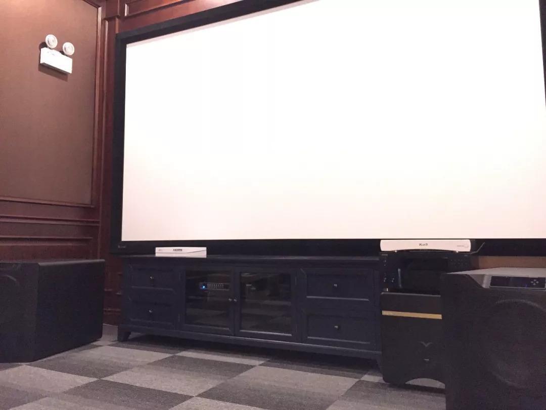 为了在不大的空间下,尽量提供更具震撼效果的视频画面,采用了150寸16:9的透声幕。所以前三主箱一致的理想要求自然也能轻松实现了。