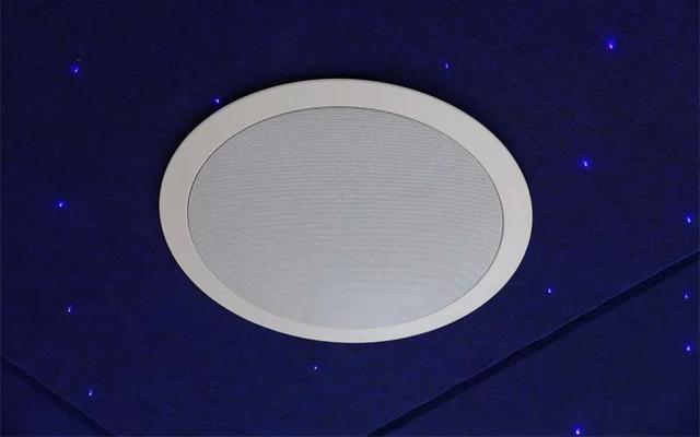 视听室的音频系统则是选用了来自美国知名品牌Klispch(杰士)的专业电影院音箱。3只前置音箱隐藏于幕布后,4只环绕音箱对称分布于视听室两侧,4只全景声音箱则嵌入星空顶内。