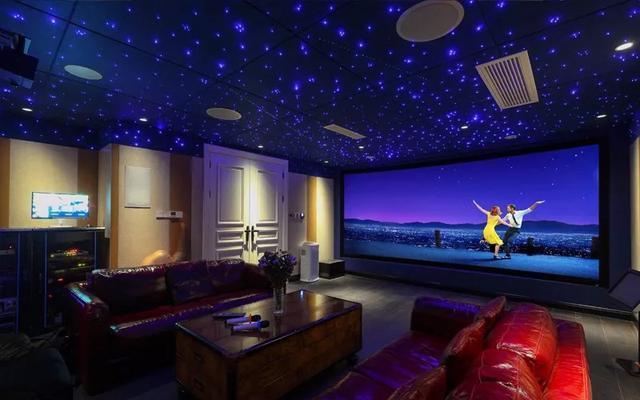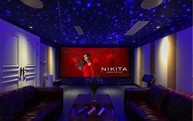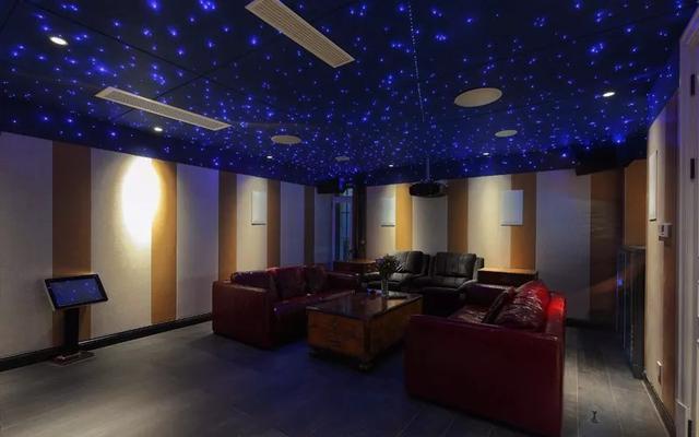 整个视听室最为吸睛的设计,要数全覆盖的星空顶。深蓝色的夜空如同一块缀满碎钻的天鹅绒,尊贵且梦幻。如果说在这里看电影是体验另一场人生,那这星空顶就是这人生不可忽视的底色。