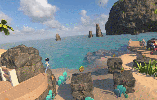 除了这些创新,《宇宙机器人:搜救行动》在关卡中借鉴了多种VR游戏模式,例如在第二星球,我们可以像在《VR极限过山车》一样坐上过山车;第三星球中,我们又可以像在《The Blu》一样全方面的探索海底世界;在《宇宙机器人:搜救行动》中你可以玩到多种多样的VR小游戏,这些穿插在了整个游戏中,并不会显得唐突。