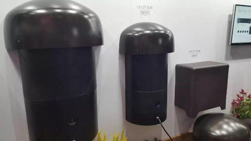 Sonance的户外音响区展示了巨大的蘑菇状插地低音炮,有12和15英寸2个版本。另一个12英寸传统箱体低音炮,则用以增强Sonance的 LS4T和LS6T以4及6英寸Landscape系列卫星音箱的低音效果。Sonance今年初改进了户外音响系统。“它性能优异但也非常灵活,”Sloan评价这些音箱,它们能为服务于70V或8欧姆系统。
