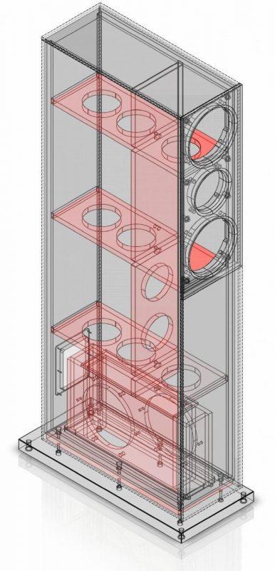 最外層是MDF和有色玻璃板,等於是藉由不同特性的材料多層次堆疊,同時兼顧強度、抑振、阻尼等多方面效果,也避免了單一材料可能產生的特定諧振(我們俗稱的箱音),提升聲音表現。