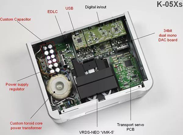 备受瞩目的CD读取机构部分,K-05Xs搭载Esoteric的VRDS-NEO VMK-5读取机构。首次运用在P-05 SACD/CD转盘上的VRDS-NEO VMK-5,其机构内中的唱片夹,由铝合金属以高精度的机器车制而出,上面还附有聚碳酸酯物质,可以降低光盘转动时产生的惯性。此外,VRDS-NEO VMK-5上的横梁,以块状模料与不锈钢制成,发挥抑振作用,再加上转轴马达透过带有转速侦测功能的伺服控制器控制,更能提高雷射头读取光盘数据的精准度。
