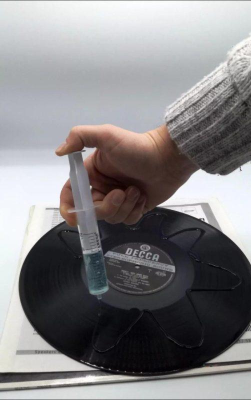 12英寸的指代我們常用的LP唱片,大型針筒上標有5-20ml(最大24ml)的容量,用戶可以吸取14-16ml進行使用。第一步,當通過大針筒吸取溶液後,對溶液迅速密封處理,免得溶液中吸引灰塵。
