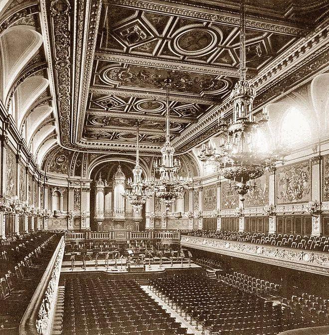 1880年前後,老的萊比錫布商音樂廳仍在運營當中,上演的作品還是以貝多芬、門德爾松、舒曼、舒伯特為主,布魯克納、斯美塔那、理乍得德·斯特勞斯的作品均不曾在這裡上演,在後浪漫主義風行的年代,這簡直是無法想像。有人將原因歸咎於老音樂廳過分狹小,聲學環境已經不再適合現代大編製樂團的演出,於是,新萊比錫大廳應運而生,權屬不再是歸於市政部門,而是音樂廳與樂團的理事會。