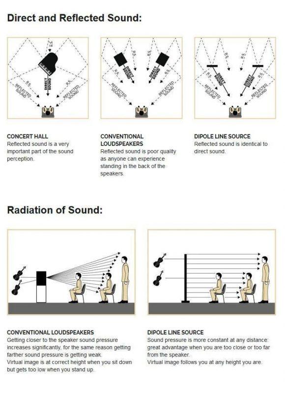 带状式多见于高音的应用,由于振膜比动圈式有着更轻的质量,因此声音的动态也更强,频段延伸可以获得更高,扩散性也足够好,同时带状式可以实现双极发声,因此能获得最佳和最广阔的音场表现,让动圈式望其项背。而以带状式来实现全频段效果,自然需要技术的改进,衍变为平板全频扬声器(或称平面磁性扬声器)。以我有限的认识,以这种原理设计的,美国品牌的Magnepan和Wisdom Audio算是烧友认识的代表。