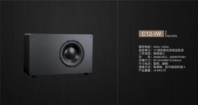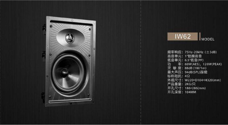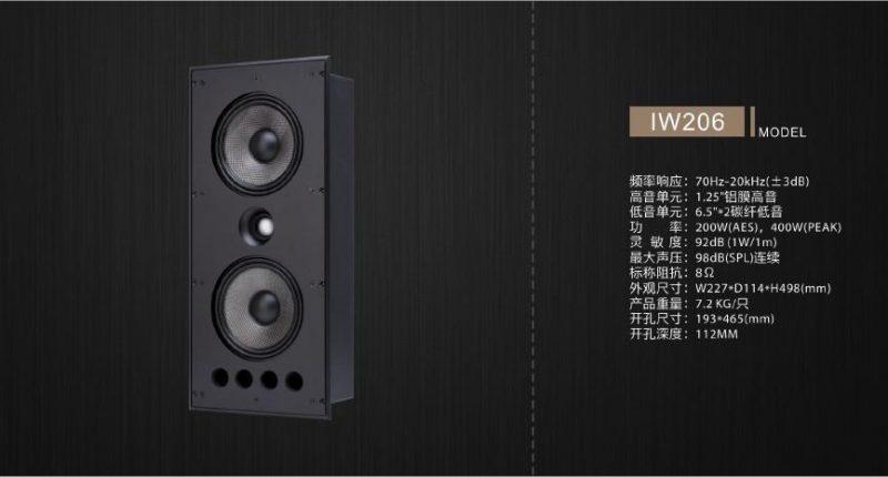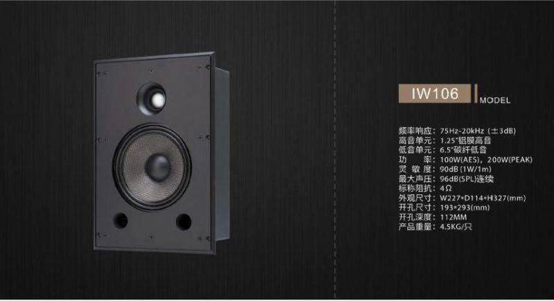 嵌入式扬声器IW406,两分频设计,四只6.5英寸碳纤维低音,一只1.25英寸铝膜高音,频率响应为70Hz-20kHz(±3dB),灵敏度94dB(1W/1m),最大持续声压119dB(SPL),7.2kg/只
