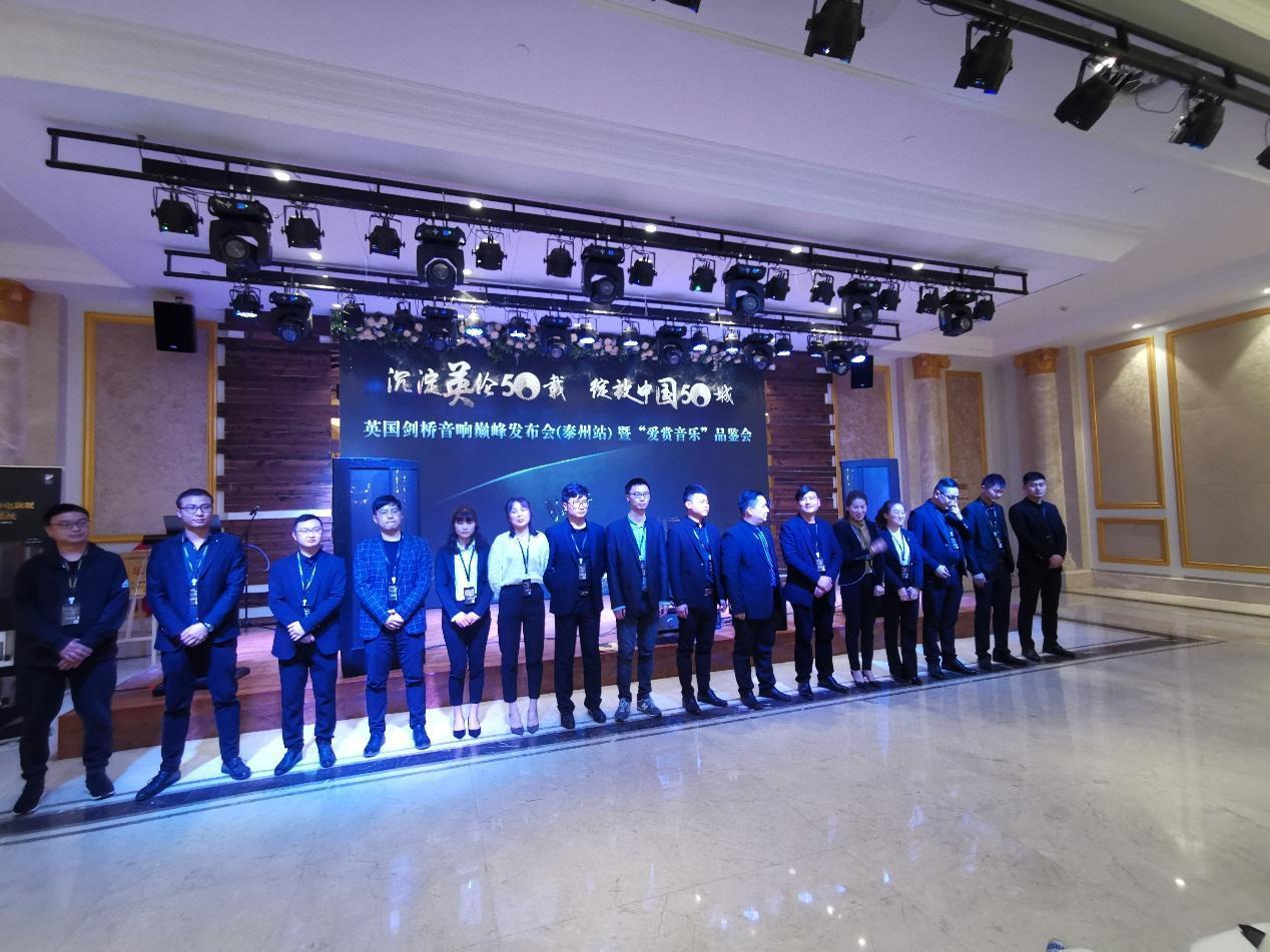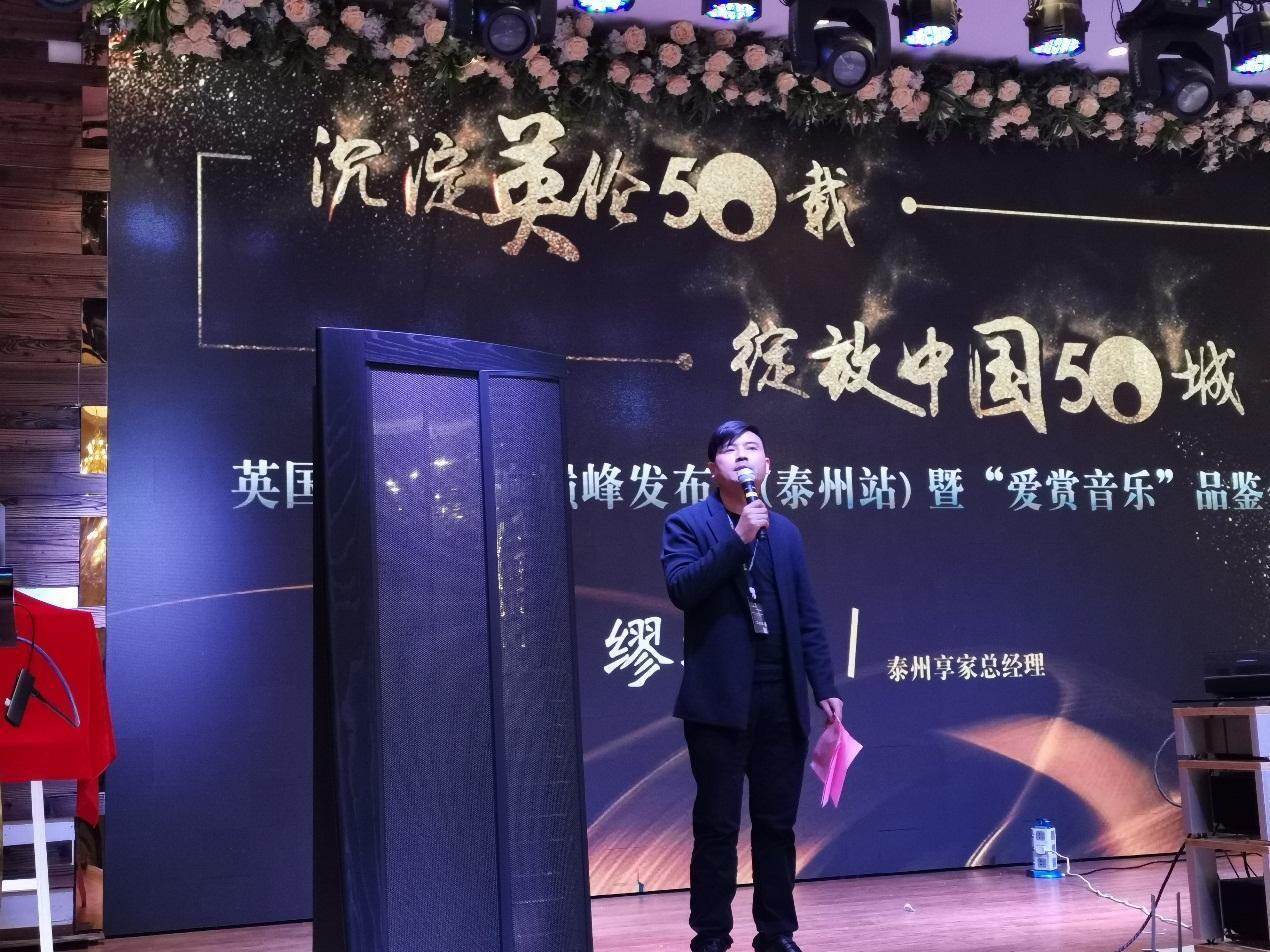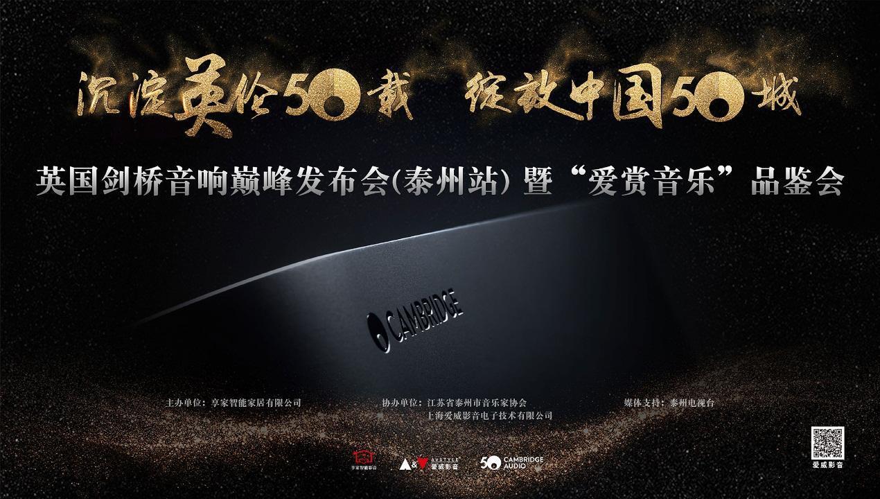 2019年3月23日,“沉淀英伦50载,绽放中国50城”剑桥巅峰系列发布会暨“爱赏音乐”品鉴会在泰州鹏欣国际大酒店举行。本次活动由泰州享家主办,泰州音乐家协会与爱威影音协办,并得到泰州电视台的大力支持。来自泰州、南京、扬州、南通、苏州等地的音乐爱好者以及来自全国20多个城市的爱威影音合作伙伴近200人共同参与了本次活动。