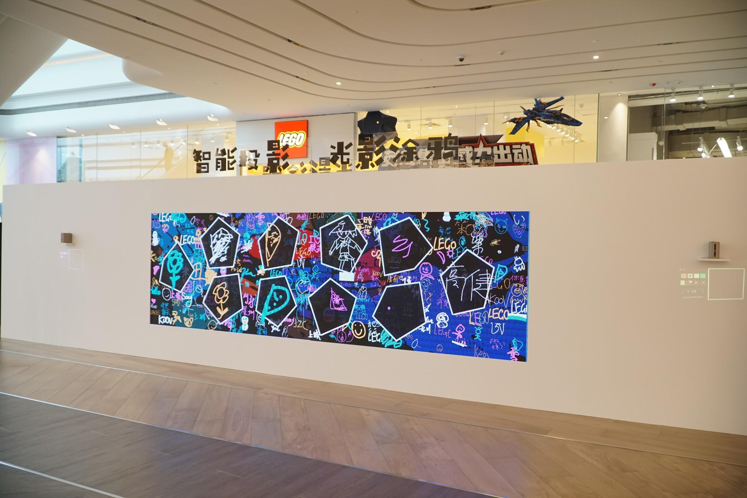 进入深业上城后能够在过道里面看到光影涂鸦区域,参观者可以在上面留言,并会被现实在大屏幕上