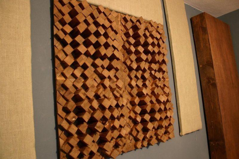 另一種方法是吸音材料的處理,為消除室內可能產生的聲學缺陷,可以採用在空間內部增加擴散體的做法,利用對牆面的凸凹的變化,使房間簡正模式均勻分佈從而實現平滑的低頻響應,改善室內聲場。