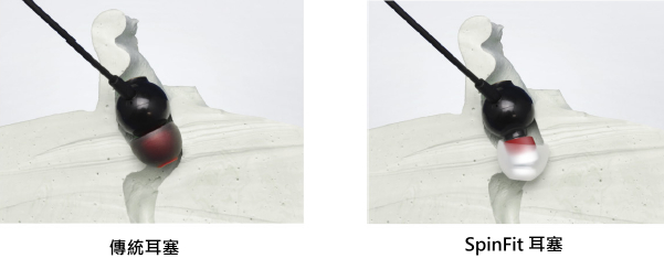 前端形状细小,所以能够比传统耳胶更深入耳道,但有可能会在第一道弯曲处因导音管曲折,而令声音变小。 | SpinFit能够贴合耳形旋转,配戴舒适,没有压迫感。在第一个耳道弯曲位置,导音管不会被曲折,可保持畅通,不会使声音变小。耳胶能顺畅地深入耳朵深处,大幅度的提升高音与低音,展现出更广的音域。 |