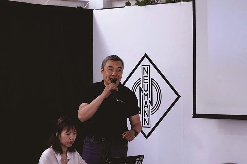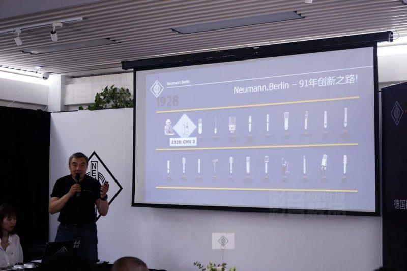 活动中,森海塞尔大中华区业务发展经理沈鹏先生先为大家带来了关于Neumann的历史背景和发展进程,其中包括介绍Neumann研发的黑胶刻碟设备,在上世纪开始推出的U47、U67、U87等服务于录音室的专业话筒,KH80、KH870等专业监听扬声器,以及包括Abbey Road在内多个知名专业录音棚的案例。