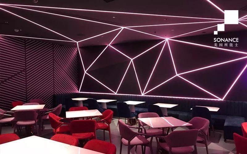 几何灯带组成的过道光影流转,是个绝佳的拍照场所。穿过过道就是餐吧、而餐吧后方就藏着整个店铺的核心区域——酒吧。