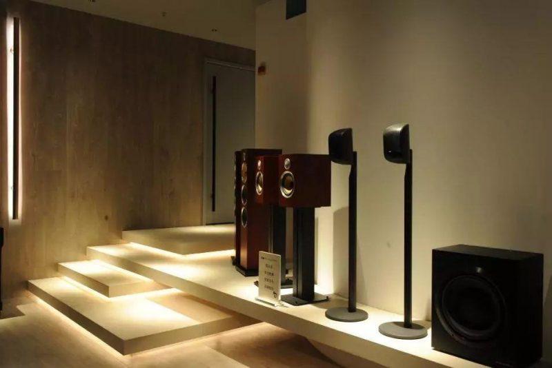 沿着走廊穿過大廳後,可以看見在設置於客廳影院後一個揚聲器展示區域。靠牆而放置顯得身形細小的M-1衛星揚聲器、還有Bowers & Wilkins 607書架式揚聲器。603座地式揚聲器被擺設在走廊的一處展示台上。