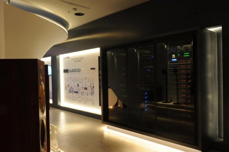 展示台對面則是用於放置路由及功放器材的三個大機櫃,眾所周知,很多影院器材在工作時都會產生或大或小的噪音,無論是投機、接收器、藍光機、空調系統、媒體服務器等所有設備都可以產生噪音。那麼如何避免這些噪音?