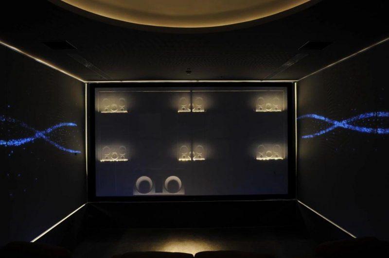 房間內採用了以Bowers & Wilkins為主的揚聲器配置,其中前置及中置揚聲器為Bowers & Wilkins CT7.3 LCRS,可能是考慮到後排影院觀眾的體驗問題,設計師在前置及中置揚聲器上再繼續配置了一個增高揚聲器,使得從透聲幕後傳達到觀眾位置的聲音能夠分佈得更加均勻,讓後排觀眾也能獲得良好的電影體驗。