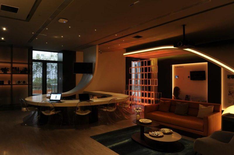 穿過玻璃旋轉門後,原本整塊的客廳區域通過進門右側的地燈及擋板的阻隔形成了一條作為緩衝區域的過道,這使得用作展示的客廳能夠更加充分地分割和利用空間。在走廊的中段,由走廊天花板開始,由上而下延伸至休息區牆面,恍若飄帶般的牆體設計完美地將「天」與「地」連接到了一起,這個天花板還採用了雙層設計,中層鋪設有RGB燈帶,通過走廊一側的LUTRON燈光控制區域,使用者能夠控制全屋的燈光。