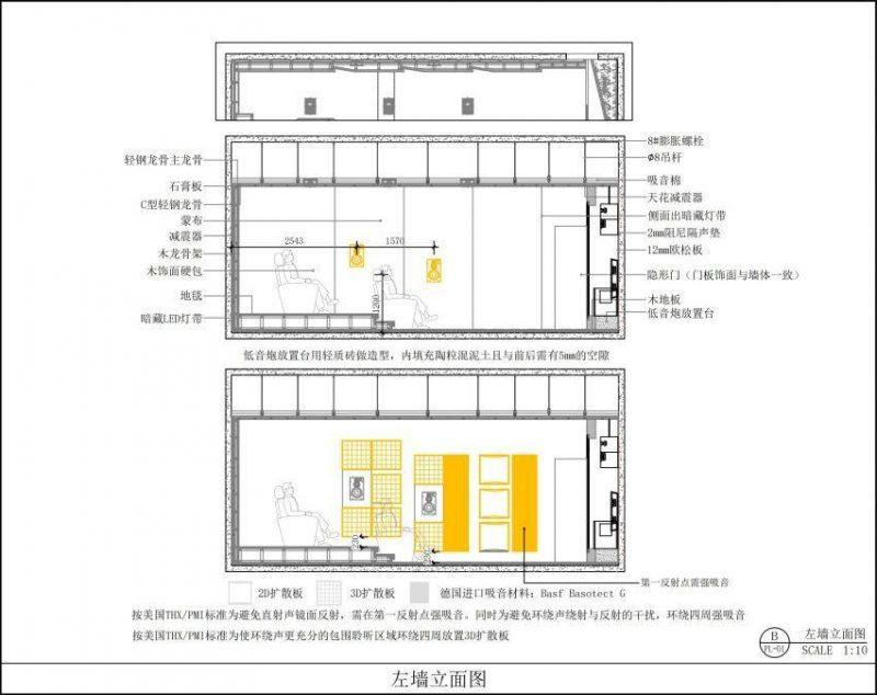 (后墙立面图,可以看出该影音室严格按照THX标准进行设计)