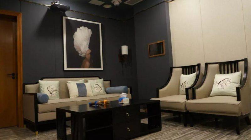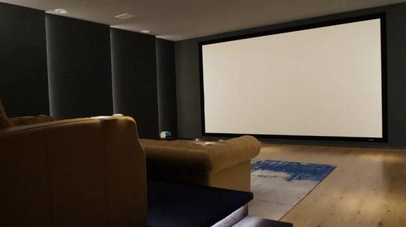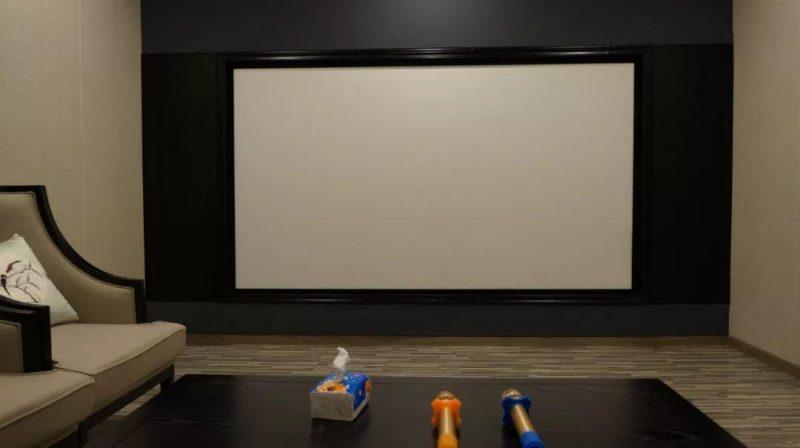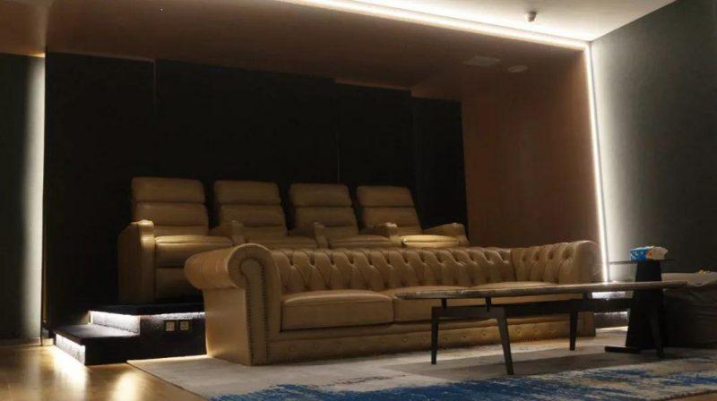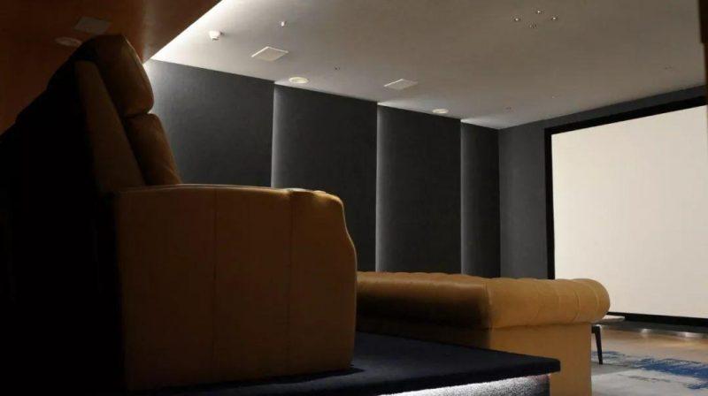 出色的影院环境离不开底层基础建设,尤其声学环境的打造。据杨先生介绍,为保证体验中心有着一流的效果,以及展现uandksound(英国之声)真实的威力,整个影院声学构造方面进行不妥协的设计,从天花到地面以及两侧的声学物料都进行全方位的加持和打造。相对小空间来说,这个接近47.09平方米(7.84m×6.04m)的私人影院在声学还算十分好处理,其建筑比例上达到1.3:1,与THX推荐的空间比例(1.3:1)基本一致,符合专业影院的规范。这个户型的先天条件十分适合作为影院,对后期设计、施工以及声效都奠定了基础。