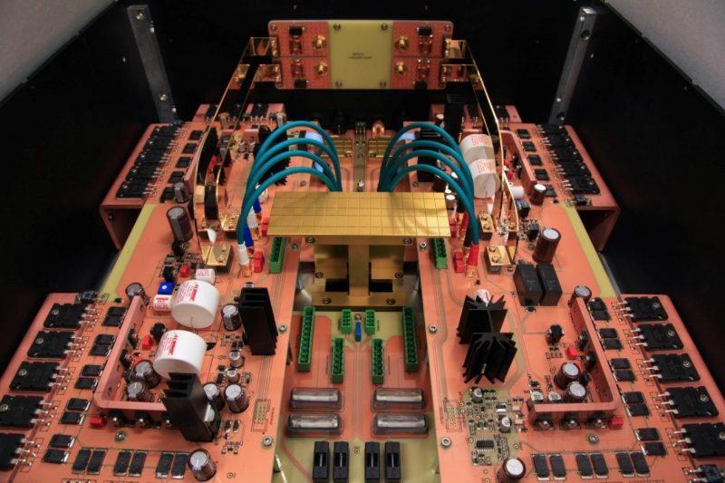 Saxum属于AB类(高偏甲类)工作状态,每声道250W(8Ω),双单声道结构。不过Saxum需要非常大的能源供应,其静态功耗为每个通道高达150W,为了把这些热量更好散掉,厂方把每声道8对功率管直接嵌入在4块5mm厚的L型实芯长条铜板上,而铜板则紧贴则厚重的机箱来散热。不同于传统的长鳍散热片,Saxum的整个箱体就是巨大的散热片,并提供足够的空间去散热。