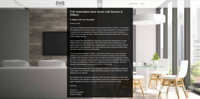 此番收購,B&W官網上還沒公布,而Eva Automation則在其官網上公布了這則令人震撼的消息。就從Eva Automation的官網來看,收購已經正式完成,而Eva Automation公司的Gideon Yu即將成為B&W的新一任執行董事長,兩家公司也將正式合併,未來共同研發、推出產品。Eva Automation公司在2014年中旬創立,創立之初只擁有20名員工,但就已獲得2000萬美元的融資,投資方包括風投機構Formation8、雅虎聯合創始人楊致遠、阿里巴巴執行副主席蔡崇信、李嘉誠以及YouTube創始人乍得·赫利(Chad Hurley)和陳士駿(Steve Chen)。