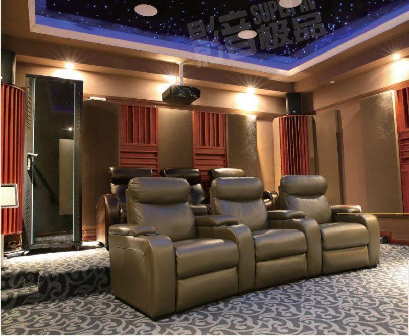 影院的地板上铺设有灰白双色花纹的厚地毡,步入房间时使人感觉一下子脚步轻盈,放下了沉重的工作和学习心情,进入准备观看电影时轻松愉快的心情状态。其实,铺设厚地毡的原因不仅仅是舒适及对影院房间的美化之用。电影院里面的地毯一般都是用尼龙或羊毛材质地毯,专业名词叫阿克明斯特地毯或者尼龙印花地毯满铺地毯,两者都可以达到防火阻燃要求。更为重要的是,厚地毯的铺设能够防止大量灰尘漂浮,因为这些漂浮的灰尘很容易影响投影幕的寿命,由于地毯的毯面为密集的绒头结构,具有很强的纳尘能力。这一方面能很好地降低了空气中的含尘量。同时,地毯具有吸音的特性,由于本次案例的私人影院被设置在建筑的二楼,一楼为生活及商用空间,因此,铺设地毯可谓一举多得。