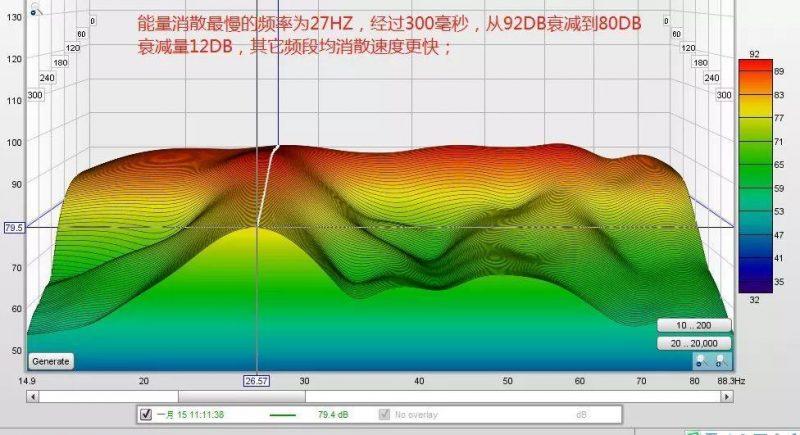 本空间实测:超低频空间瀑布能量消散最慢的点在约27Hz(超级精准吻合长度方向驻波结点)经过300毫秒,从约92dB衰减到80dB,衰减量约12dB,其它频段消散速度更快。