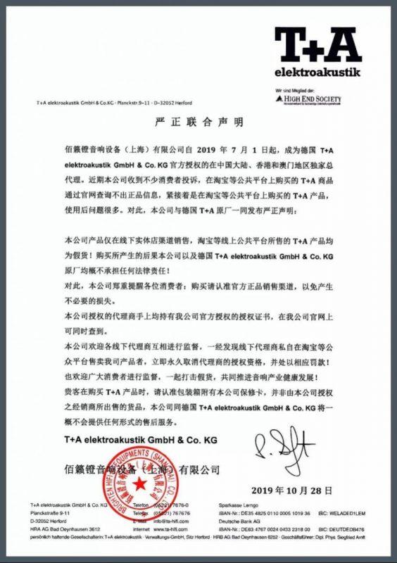 近期,佰籟鐙音響設備(上海)有限公司收到不少消費者投訴,在淘寶等公共平台上購買的T+A商品通過官網查詢不出正品信息,在淘寶等公共平台上購買的T+A產品,使用後問題很多。對此,佰籟鐙音響設備(上海)有限公司與德國T+A原廠一同發佈嚴正聲明,聲明如下: