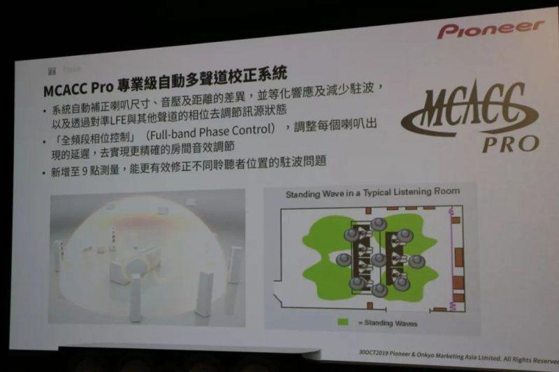 MCACC Pro(Multi-Channel ACoustic Calibration system Pro)是Pioneer研發之自動房間校正技術巔峰之作,能夠透過接收機定製的麥克風,創造理想的聲學環境,制動系統自動補正揚聲器尺寸,聲壓及距離的差異 ,並等化響應及減少駐波,以及通過對準LFE與其他聲道的相位差去調節信號源狀態。更重要的是,專業級MCACC Pro的「全波長相位控制」(全頻帶相位控制) ,通過MCACC Pro之校準對安裝於上空的喇叭亦有效,因此它可呈現由最多到上空無縫連接的理想環繞聲音場。。