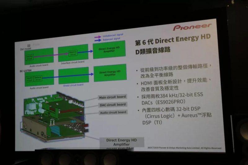 長期以來,Pioneer的Direct Energy HD擴音線路持續發展,在SC-LX704上發展發展至第6代。用上與日本Shinyei Capacitor(神栄キャパシタ)共同開發的音響級全新定製薄膜電容,讓聲音表現進一步提升。