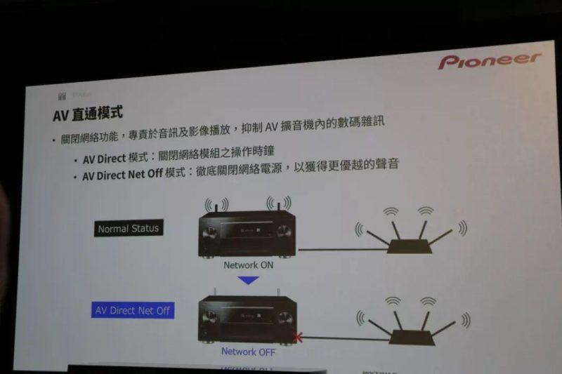 「AV直通模式 」關閉網路功能,只專責於音頻及影像播放,以抑制AV接收機內部的其他數碼噪聲,從而改善模擬、數字輸入、HDMI播放等的音質。「AV Direct」模式關閉網路模組之操作時鐘 ,而「 AV Direct Net Off」模式徹底徹底關閉網絡電源,提供更優越的聲音。