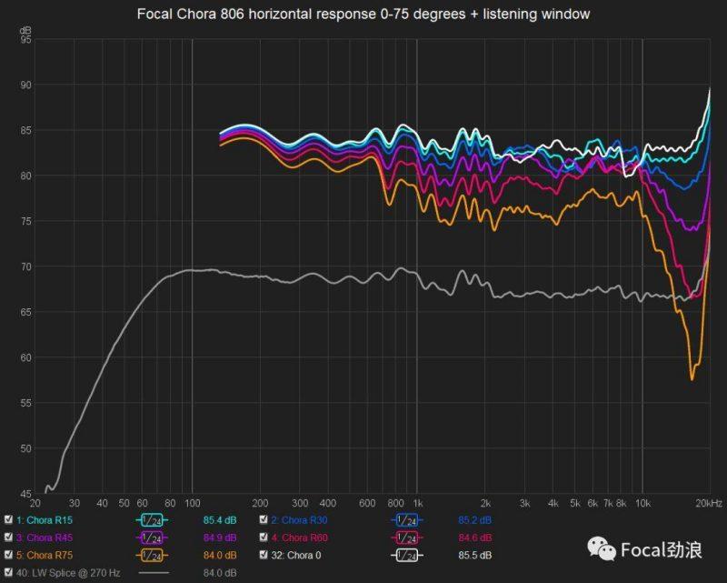 底部的灰色曲線是最重要的一條線,因為它是在±30度水平和±10度垂直「試聽窗口」內聲音輻射的平均值。「這是你在主要聆聽區域上聽到的最具代表性的直接聲音,因為我們通常不是百分百坐着不動的。